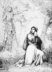 Зі свідчень д'Арк на суді відомо, що перше видіння вона пережила 12-річною, близько 1424 року. Будучи наодинці в полі, вона побачила три постаті, в яких упізнала архангела Михаїла, святу Катерину та святу Маргариту, що звеліли їй вигнати англійців з французької землі і привести дофіна у Реймс на коронацію. Д'Арк говорила, що заплакала, коли постаті пішли — настільки вони були прекрасними[17]. Через п'ять років вона втілить побачене.
