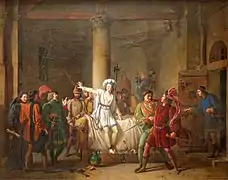 23 травня 1430 року вона була схоплена бургундською фракцією в Компієні, групою французьких дворян, союзниками англійців. Пізніше її передали англійцям[10] і проанглійський єпископ П'єр Кошон на сфабрикованому суді засудив її до смерті[11], після чого вона була спалена живце́м у Руані 30 травня 1431 року «за єресь, відьомство і ході́ння в чоловічому одязі», загинувши у віці близько дев'ятнадцяти років[12].