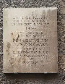 1455 року папа Калікст III звелів провести новий процес юридичної реабілітації і призначив трьох своїх представників спостерігати, зокрема архієпископа Реймса Жана Жувенеля дез Урсена головою[63]. Суд засідав у Парижі, Руані і Орлеані, розслідування велось і на батьківщині д'Арк. Легати папи і судді допитали 115 свідків, зокрема матір Жанни Ізабель Ромі, її товаришів по зброї, простий люд Орлеану.
