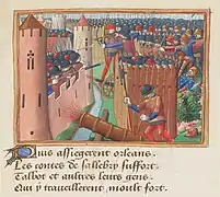 - Всупереч цьому рішенню д'Арк 7 травня наполягла на атаці головної твердині англійців — Ле-Турель[28]. Діставши поранення стрілою в плече, але повернувшись, щоб повести військо в останній наступ, д'Арк здобула статус героїні в очах сучасників[29]. Увечері Турель була взята.
