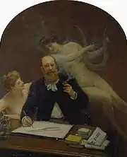 Поруч стоїть його картинка зовсім іншого штибу: перед молодиком у капелюсі та піджаку, який лежить на пагорбі і безтурботно палить цигарку, дефілюють прямо по повітрю, навіть без хмар, сучасні діви різних характерів і положень: аристократка з лорнетом, гризетка з посмішкою, канканерка з закинутою на небо ногою і так далі, до простих розносчиць і служниць. Всі ці дівчата в сучасних костюмах. А якщо це не до смаку іншому глядачеві, то поруч стоїть маленький портретик дідка письменника, який палить, з двома оголеними музами на плечах. Ця картинка написана особливо старанно. Є і ще три портрети, вже без всяких претензій і такої ж маленької величини[20].