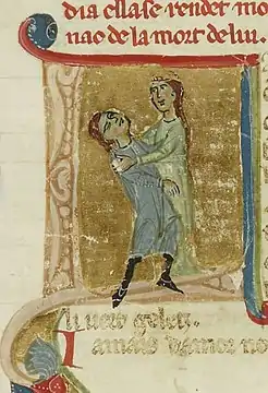"Jaufres Rudels de Blaia si fo mout gentils hom, princes de Blaia. Et enamoret se de la comtessa de Tripol, ses vezer, per lo ben qu'el n'auzi dire als pelerins que venguen d'Antiocha. E fez de leis mains vers ab bons sons, ab paubres motz. E per voluntat de leis vezer, el se croset e se mes en mar, e pres lo malautia en la nau, e fo condug a Tripol, en un alberc, per mort. E fo fait saber a la comtessa et ella venc ad el, al son leit, e pres lo antre sos bratz. E saup qu'ela era la comtessa, e mantenent recobret l'auzir e•l flairar, e lauzet Dieu, que l'avia la vida sostenguda tro qu'el l'agues vista ; et enaissi el mori entre sos braz. Et ella lo fez a gran honor sepellir en la maison del Temple ; e pois, en aquel dia, ella se rendet morga, per la dolor qu'ella n'ac de la mort de lui. " |
