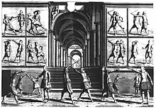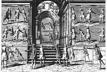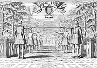 ![]() Позиції по прямій лінії. Ілюстрація з трактата Жерара Тібо "Академія меча"[2] | ![]() Способ уявлення меча опоненту по прямій лінії. Ілюстрація з трактата Жерара Тібо "Академія меча"[6] |