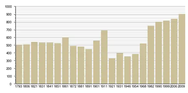 Динаміка населення (base Cassini de l'EHESS pour les nombres retenus jusque 1962[3], base Insee à partir de 1968 (population sans doubles comptes puis population municipale à partir de 2006)[4] · [5] ):