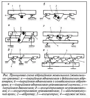- 1) Установка для перевантаження і класифікації гірничої маси в перевантажувальних комплексах на кар'єрах при потоковій і циклічно-потоковій технологіях. Умовно виділяють власне вібраційні живильники та вібраційні живильники-грохоти. Привод вібраційного живильника буває інерційний або ексцентриковий. Вібраційний живильник з інерційним приводом виконується за одномасною і двомасною схемою. У одномасних живильниках використовуються вібратори дебалансного і самобалансного типів. У двомасних установках, що складаються з вантажонесучого органу, вібратора, робочих пружних зв'язків і амортизаторів, є реактивна маса, якою служить спеціальна важка рама або сам вібратор. Живильники з ексцентриковим приводом частіше за все виконують за одномасною схемою. Продуктивність вібраційних живильників-грохотів до 2000 т/год, частота коливань 730 хв−1, кут нахилу при встановленні не перевищує 15°.