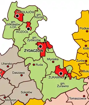 - Жидачівський — з міської ґміни Жидачів та сільських Жидачів і Руда;