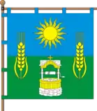 Квадратне полотнище розділене горизонтально на дві рівновеликі частини, на верхній жовте сонце з шістнадцятьма променями, на нижній жовтий колодязь на білому мурованому фундаменті, з білим дахом і ворітком. По сторонам від сонця і колодязя два жовтих вертикальних колоски.