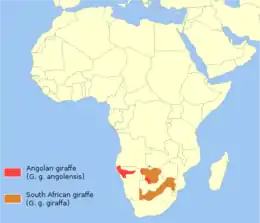 | Ангольська жирафа (G. g. angolensis), також відома як намібійська жирафа | Ареал цього підвиду знаходиться у південній Намібії, південно-західній Замбії, Боствані та у західному Зімбабве. Цей підвид має великі коричневі плями. Плями на шиї та крижі досить малі. Також представники цього підвиду мають білу пляму на вусі.[3] Близько 13 000 тварин живе у природі та близько 20 — у зоопарках.[1] | ![]() |