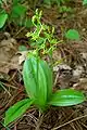 Трав'яниста рослина 8-25 см заввишки, геофіт. Кореневище коротке. При основі стебла розташована псевдобульба, обгорнута піхвами старих листків. Стебло пряме, голе, жовтувато-зелене. Листків, розташованих при основі стебла, 2 (рідше — 3), вони загострені, широколанцетні, лискучі, завдовжки 2-11 см.