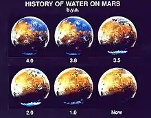 Вода на Марсі існує майже виключно у вигляді льоду, з розташуванням на полюсах планети у форматі марсіанських полярних льодових шапок, а також на невеликій глибині під марсіанською поверхнею, в тому числі в інших температурних широтах.[66][67] Невелика кількість водяних випарів присутня в атмосфері.[68] На самій поверхні Марса не існує водних об'єктів із водою саме у рідкому стані, оскільки середнє значення атмосферного тиску на поверхні становить близько 600 паскаль — 0,6 % від земного нормального атмосферного тиску (на рівні моря), — а також тому, що температура на Марсі є надто низькою (−63 °C), що призводить до негайного замерзання. Незважаючи на це, близько 3.8 мільярда років тому[69] атмосфера була густішою, температура вищою, і вода у незліченних кількостях текла поверхнею планети,[70][71][72][73] формуючи, окрім річок та озер, величезні океани.[74][75][76][77] За приблизними оцінками, примордіальні марсіанські океани мали б покривати від 36 %[78] до 75 % поверхні планети.[79]
