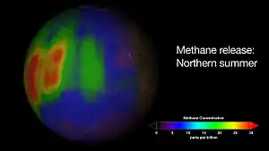 Залишки метану в атмосфері Марса були відкриті у 2003 році та підтверджені у 2004.[100][101][102][103][104][105] Оскільки метан — газ нестабільний — його присутність означає, що на планеті мусить бути якесь активне його джерело, яке дозволило б утримувати його на такому кількісному рівні в атмосфері. За приблизними оцінками, Марс мав би продукувати до 270 тонн метану за рік,[106][107] проте удари астероїдів можуть бути відповідальними за виробництво лише 0,8 % загального обсягу метану. Хоча й припускають існування геологічних джерел метану, таких як серпентинізація, однак брак теперішньої вулканічної, гідротермальної активності або гарячих точок[108] говорять всупереч теорії геологічного походження метану. Було висловлено припущення, що метан виробляється в результаті хімічних реакцій у метеоритах, які відбуваються під впливом сильного розжарювання при входженні в атмосферу. Однак дослідження, опубліковане в грудні 2009 року виключило таку можливість,[109] натомість результати іншого дослідження, опубліковані у 2012 році, дозволяють зробити припущення, що джерелом метану можуть виявитись органічні сполуки у складі метеоритів, які трансформуються у метан під впливом ультрафіолетового випромінювання.[110]