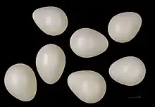 У кладці 6-7, інколи 5 або навіть 8-9, а у виключних випадках 10 яєць. Яйця чисто-білі, блискучі. Розміри яєць в середньому становлять 27,7×21,25 мм.