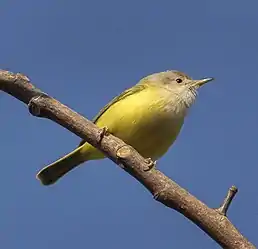 Голова бліда, коричнювато-сіра, над очима свтлі "брови". Верхня частина тіла зелена, гузка жовтувато-зелена, горло і верхня частина грудей білі, нижня частина тіла лимонно-жовта. Дзьоб чорнуватий, знизу світліший. Лапи світло-коричневі[5].