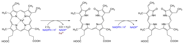 - гем + 3 AH2 + 3 O2 білівердин + Fe2+ + CO + 3 A + 3 H2O