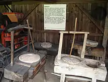 Дещо складнішу конструкцію мав ручний млин, що відрізнявся від жорен наявністю двох рам з корбою, цівкової передачі і коша з механізмом регулювання подачі зерна[8].
