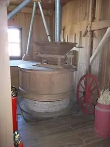 Нижнє жорно зазвичай закріплене нерухомо, верхнє обертається на осі («веретені»). У центрі верхнього жорна є отвір (прого́рниця, діал. дуча́йка), у який з коша подається зерно; на нижній поверхні встановлюється металева, первісно дерев'яна деталь (порпли́ця, рідше поркли́ця), призначена для з'єднання жорна з веретеном. В отвір нижнього жорна вставлена втулка (ва́ржіль[13], вардзель), через яку проходить нижнє веретено, вільно обертаючись у ній. Привод жорна може розташовуватися по-різному: на деяких веретено проходить до верхнього жорна знизу через нижнє (нижньоприводне жорно); на інших типах млинів привод розташований зверху, нижнє ж веретено грає роль вальниці (верхньоприводне жорно). Підвищення в млині, де розташовувалися жорна, називалося подо́к[14] (під, на водяному млині обру́б)[15][16], і воно обносилося огорожею — бу́ртницею[17], буртом[18], нижнє жорно закріплялося в брусах (обру́бинах)[19]. Над жорнами розміщався ящик для зерна (кіш) з жолобом (коритцем, коритком). Для рівномірного надходження зерна в жорно коритце споряджується спеціальними автоматичними пристроями. Більшість з них включають вертикальну паличку, одним кінцем закріплену на опорі коша, яка прив'язується шнурком до коритця і грає роль пружини, повертаючи його на місце по завершенню циклу роботи пристрою. Коритце підвішується рухомо на шнурі, а натяг шнурів регулюється за допомогою брусочка, одним кінцем закріпленого, другим пересуваного по зубчиках опори коша. На нижньоприводних і верхньоприводних жорнах деталі штовхального механізму розрізняються: на нижньоприводних знизу до коритця прикріплена вертикальна паличка (риштак[20], спружина)[21], яка нижнім кінцем входить в отвір верхнього жорна, де встановлене кільце з кулачками, що під час обертання жорна періодично штовхає коритце; на верхньоприводних верхнє веретено має ребра, що під час обертання веретена штовхають виступний кінець (ручку, коник) коритця. Жорна оточують дерев'яним чи луб'яним кожухом (обичайкою), що утримує борошно від розсипання[22]. Борошно виходило з обичайки по трубці — лото́чку, укріпленій у спеціальній дошці — бу́рхвиці[23][24], а для його збору під бурхвицею встановлювали ящик чи жолоб (мучник, скриню)[25][26]. Пара з верхнього і нижнього жорен називалася поса́д[27] (рідше поста́в, заст. коло, оса́да)[28][29][30]; на млині може бути один чи кілька посадів, кожний з них має привод від головного вала.