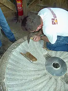 Робочі поверхні жорен покриті спеціальними жолобками («борознами», англ. furrows), що ділять їх на окремі плоскі ділянки («мелючі поверхні»). Від борозен, розширяючись, відходять дрібніші жолобки («оперення»; feathering, cracking). Рисунок борозен і мелючих поверхонь повторюється, утворюючи на жорнах однакові ділянки («арфи», harps). У типового жорна налічують 6, 8 чи 10 таких «арф». Прилеглі мелючі поверхні обох жорен утворюють різальні крайки, що забезпечує «ефект ножиць» при меленні, коли зернина, потрапляючи між борозенками верхнього і нижнього жорен, розривається борозенними крайками. Завдяки тому, що борозни спрямовані від центру до периферії, розмелені частинки просуваються від прогорниці до окружності жорен. З плином часу борозни стираються, тому карбування періодично мусять поновлювати. Цим займалися спеціальні майстри, яких звали жорнярами. Карбування проводили спеціальним молотком за назвою оскард (чи «оскарб»).