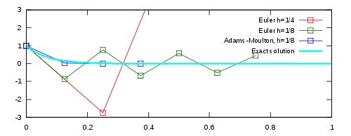 Зображення (праворуч) ілюструє вади різноманітних методів застосованих до цього рівняння.