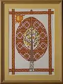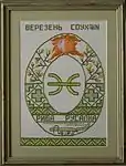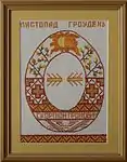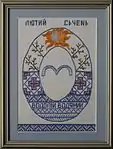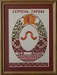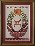 ОСІНЬ[5]. Основу вишивок становить помаранчева барва, що асоціюється з радістю, плодючістю, щедрістю, благістю теплого сонця. На всіх мініатюрах зображено хрест — найдавніший і найпотужніший оберіг із невичерпним символізмом. Хрест символізує чоловіче і жіноче начала, взаємодію духовного і матеріального. Світове дерево — це óбраз людини, Сонця. Хрест у колі — символ землі-годувальниці. На писанках-місяцях використано орнамент із обрядової чаші (Черняхівська культура), який позначає ті чи інші сезонні роботи.