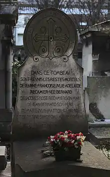 - Могила № 3 на 30-й ділянці, увінчана хрестом з латинським написом crux, ave, spes unica («вітаю тебе, хресте, єдина надія»), на одному з її боків є напис «У цій могилі злучилися останки Жанни-Франсуази-Жулі-Аделаїди Рекам'є, уродженої Бернар, Жака-Роза Рекам'є, її чоловіка, Жана Бернара, її батька, Марі-Жулі Маттон, її матері, і П'єра-Сімона Балланша, її друга. Молітеся за них», на другому боці «Марі-Жулі Бернар, уроджена Маттон, 21 січня 1807. Жан Бернар, 19 березня 1828. Жак-Роз Рекам'є, 19 квітня 1830. П'єр-Сімон Балланш, 12 червня 1847. Жанна-Франсуаза-Жулі-Аделаїда Рекам'є, уроджена Бернар, 11 травня 1849». Джерело: Édouard Herriot, op. cité, p. 401