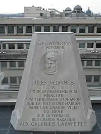 19 січня 1919 року для реклами Жуль Ведрін посадив свій літак на дах Галереї Лафайєт, отримавши за це від галереї 25000 франків.[8]