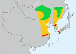 ![]() Мапа поширення виду: зеленим - гніздування; жовтим - на перельоті; червоним - на зимівлі. | ||||||||||||||