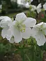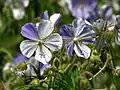 Квітки на довгих квітконіжках, опушених залозистими волосками, у складному цимозному суцвітті, складеному із зближених монохазіїв. Квітки завширшки близько 3 см, п'ятичленні, актиноморфні, п'ятиколові. Чашечка роздільнолиста, зелена, залишається при плодах. Чашолистки опушені простими залозистими волосками, овальні або довгасті, з довгим остюком на верхівці і трьома помітними, часто ліловими жилками. Віночок майже вдвічі ширший від чашечки, бузково-синій, широко відкритий. Пелюстки оберненоширокояйцевидні, з дуже короткими, іноді слабо опушеними нігтиками і округлими відгинами. Тичинок 10, вони розташовані у двох колах. Тичинки зовнішнього кола коротші від тичинок внутрішнього кола. Тичинкові нитки при основі розширені і злегка зрослі. Тичинки внутрішнього кола з великими, прикріпленими до основ нектарниками, опушеними довгими волосками. Пиляки довгасті, бузкового кольору, хиткі.
