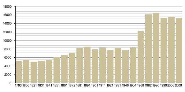 - Démographie. Avant 1968 : Cassini ; depuis 1968 : recensements INSEE., наведено за французькою вікіпедією