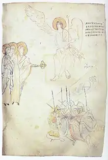Раптом стався великий землетрус; з небес зійшов ангел Господній. Він, приступивши, відвалив камінь від гробу Господньогоі сів на ньому. На вигляд він був немов блискавка, і одяг мав білий наче сніг. Воїни, що були на варті біля гробу, тремтіли від страху, зробившись немов мертвими, а потім, отямившись від страху, розбіглись.