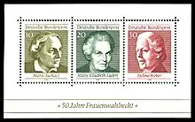 Жінки Німеччини отримали право голосу на виборах до Національних зборів 30 листопада 1918 року та вперше скористались ним на загальних виборах наступного року. Однак тривалий час, до 1926 року, на виборах у Веймарській республіці використовувались два види бюлетенів: окремо для чоловіків і жінок[39]. З приходом до влади націонал-соціалістів жіноче виборче право було скасовано 1933[40]. Відновлення жінок у правах відбулось лише 1948 року в Західній Німеччині, а 1949 — в НДР[41].