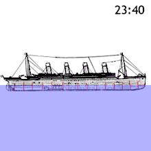 - 2:20 — Через 2 години і 40 хвилин після зіткнення, кормова частина Титаніка стає майже вертикально (під кутом в 70°) і починає швидко занурюватись. Через півхвилини вода замикається над кормовим флагштоком Титаніка