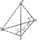 Задача Ганзена (рос. задача Ганзена, англ. Hansen's problem; нім. Hansen’sche Aufgabe f) у геодезії і маркшейдерії названа іменем данського астронома і геодезиста Петера Андреаса Ганзена. Задача полягає у визначенні координат двох пунктів D і C (див. рис.) по виміряних на цих пунктах напрямах на задані пункти А і В і взаємних напрямках DC і CD. На визначуваних пунктах D і С вимірюють кути 1, 2, 3 і 4. Задачу вирішують у такому порядку: точку D приймають за початок умовних плоских прямокутних координат x'Dy', а напря-мок DC — за позитивний напрямок осі ординат. Відстань DC умовно приймають рівною 1. Користуючись умовни-ми координатами точок D (х' = 0 і у' = 0) і З (x's = 0, y's = 1) і виміряними кутами на цих пунктах, обчислюють за правилами прямої засічки (див. засічка пряма) умовні координати точок А (х'А й у'А) я В (х'В і у'В), а по них умо-вні дирекційні кути Т'АВ і Т'ВА. Потім по умовних дирек-ційних кутах знаходять у трикутнику ABD кути при точках А і В, і за правилами прямої засічки обчислюють з цього трикутника шукані координати точки D, користуючись ві-домими координатами точок A і В. Шукані координати точки С можуть бути обчислені з трикутників CDA, CDB і CAB. Правильність визначень координат контролюють завдяки додатково виміряному напряму з пункту D або С на третій відомий пункт по виміряній відстані між пунктами D і С.