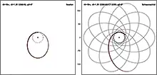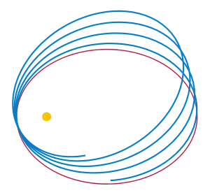 які відповідають екстремальним значенням ζ. Дійсний період еліптичної функції Веєрштрасса становить 2ω1; таким чином, частинка повертається до того ж радіуса, коли кутова координата зростає на 2ω1, що, взагалі кажучи, відрізняється від 2π. Тому орбіта як правило прецесує, однак при кут прецесії за один оборот (2ω1 − 2π) досить малий.