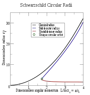тобто коли дві притягальні сили — ньютонова гравітація (перший член) і її релятивістська поправка (третій член) — точно збалансовані відцентровою силою відштовхування (другий член). Існують два радіуси, на яких досягається ця компенсація