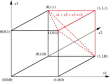 На малюнку поруч показано застосування методу для задачі з трьома вузлами. У відповідність трьом можливим ребрам між вершинами зіставляються бінарні змінні та . В цьому випадку існує лише один можливий маршрут, а саме той, що проходить через три вершини. Цей маршрут задовольняє нерівності , що стверджує, що маршрут повинен проходити через щонайменше дві вершини. Окрім цього маршруту, що відповідає вектору (1,1,1), задовольняють нерівності також всі точки у відміченому червоним регіоні цієї нерівності. Площини, що проходять через червоні лінії відсікають всі кути, що відповідають неіснуючим маршрутам із щонайбільше одним ребром, а саме, нуль-вектор (0, 0, 0), одиничні вектори (1, 0, 0), (0, 1, 0) та (0, 0, 1). Сильніша нерівність відсіче від одиничного куба все, окрім єдиної припустимої точки (1, 1, 1). В цьому окремому випадку можна досягти трьома нерівностями типу (1).