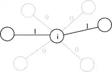 В сумі кожний доданок дорівнює або 1 (належить маршруту) або 0 (не належить). Тобто, отримана сума дорівнює кількості ребер в маршруті, таких що мають вершину на одному з кінців. Вона дорівнює 2, оскільки кожна вершина має вхідне та вихідне ребро. У наведеному поруч малюнку вершина показана з вхідним та вихідними ребрами, а ребра маршруту відмічено товстішими лініями. Поруч з ребрами вказано ваги що додаються до вказаної вище суми.