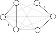 для всіх множин вершин де . Ця сума дорівнює сумі ваг ребер маршруту між вершиною та вершиною . Аби усунути зайві нерівності, можна обмежитись множинами вершин з щонайменше двома та щонайбільше вершинами. На малюнку поруч ребра з вагами відмічено товстішими лініями а решта ребер має вагу . Введення додаткових умов (2) для множини вершин , що складається з трьох лівих вершин, буде гарантувати, щоб сполучалась через щонайменше два ребра маршруту з трьома вершинами справа, аби усунути обидва цикли. Кількість нерівностей усунення циклів відповідно до Данциґа, Фалкерсона та Джонсона дорівнює .