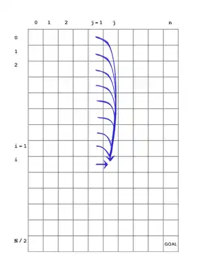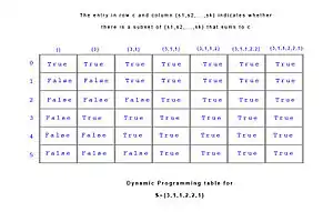 Алгоритм полягає в тому, щоб створити таблицю розміру по n , що містить значення повторення. Пам'ятайте, що K - це розмір суми, а N - це . кількість елементів. Коли вся таблиця заповнена, поверніть P(, n). Нижче наведено зображення таблиці P. Існує синя стрілка від одного блоку до іншого, якщо значення цільового блоку може залежати від значення вихідного блоку. Ця залежність є властивістю рекурентного співвідношення.