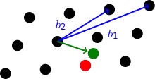Для вирішення -наближеною версії ЗНВγ для для евклідової норми кращий відомий підхід базується на використанні редукції базису ґратки. Для великих алгоритм Ленстра — Ленстра — Ловаш (алгоритм ЛЛЛ) редукції базису ґратки може знайти рішення за поліноміальний час від розмірності ґратки. Для малих значень зазвичай використовується блоковий алгоритм Коркіна — Золотарьова (БКЗ, англ. Block Korkine-Zolotarev algorithm, BKZ)[16][17][18], де вхід алгоритму (розмір блоку ) визначає часову складність і якість виходу — для великих аппроксимаціонних коефіцієнтам достатній малий розмір блоку і алгоритм завершується швидко. Для малих вимагається більший , щоб знайти досить короткі вектора ґратки, і алгоритм працює довше. БКЗ-алгоритм всередині використовує алгоритм точного ЗНВ як підпрограми (працює на ґратці розмірності, не перевершує ), і загальна складність тісно пов'язана з вартістю цих викликів ЗНВ в розмірності .