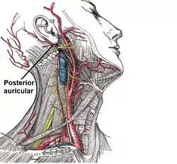 | Кровопостачання голови та шиї: лицева артерія позначна як "Posterior auricular". | |