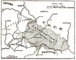 Закарпатська Україна — перехідне державне утворення, створене у листопаді 1944 року на території Закарпаття за сприяння радянської військової адміністрації після вигнання німецьких і угорських окупаційних військ. Спершу формально існувало у складі Чехословацької Республіки, а у 1945 за мирним договором між ЧСР й СРСР стало частиною Радянської України.[3] Основу політичного ладу Закарпатської України становили народні комітети, однак їх формування відбувалося під контролем представників радянського командування, тому вони відігравали роль переважно органів місцевого самоврядування.[4]