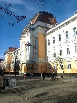Навчальний корпус розташований у приміщенні колишнього Палацу комітатського суду, корпус якого збудували усього за два роки. У 1907 році, після оголошеного урядом королівської Угорщини конкурсу, був обраний проект архітектора Міклоша Ібла — у стилі французького бароко. Протягом наступних двох років (1908—1909) проект був реалізований. В радянський час у історичній будівлі ненадовго розмістили казарму, а потім, надовго, «Завод точної механіки». На початку незалежності в частині палацу розміщувались кілька адміністративних установ, згодом ще й дитяча бібліотека.