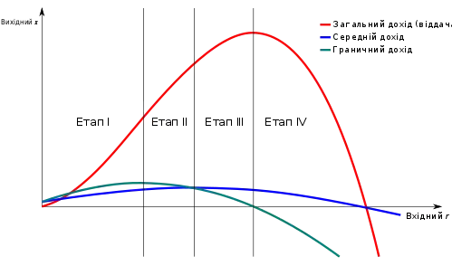 Третій відрізок характеризується зростанням функції доходності менше за пропорціональну. На цьому етапі знижується і функція граничної доходності, і функція середньої доходності. Етап III обмежується максимумом функції доходу, а в цій точці інтервалу функція граничної доходності перетинає абсцису. Математично це можна визначити, встановивши першу похідну рівною нулю.