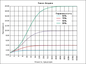 де — прискорення програми (як відношення до її початкового часу роботи); — частина яку можна виконувати послідовно; — частина, яка виконується паралельно; — кількість процесорів. Якщо послідовна частина програми виконується 10 % всього часу роботи, неможливо прискорити виконання такої програми більше ніж в 10 разів — незалежно від того, скільки процесорів використовує програма.
