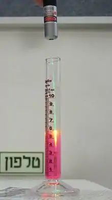 Ілюстрація зменшення інтенсивності світла в рідині. Розсіяне світло від зеленого променя лазера зменшується з глибиною.