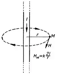 де — магнітна індукція в точці М на відстані r від прямолінійного провідника із струмом I (мал. 1); k — коефіцієнт пропорційності, величина і розмірність якого залежать від вибору системи фізичних величин, r — радіус-вектор.