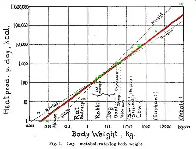 До недавнього часу вважалося, що метаболізм (обмін речовин) самих різних організмів, як одноклітинних, так і багатоклітинних, залежить від їх розміру подібним чином. Зі збільшенням маси тіла M організмів споживання ними енергії R зростає, але не лінійно, а поступово уповільнюючись, з показником ступеня, рівним приблизно 3/4. Іншими словами, в розрахунку на одиницю маси інтенсивність метаболізму організмів знижується в міру збільшення маси тіла. Отримане алометричне (порушуються пропорції) співвідношення можна записати формулою: R = c • Md, де c — константа, характерна для даної групи організмів, а d — показник ступеня, рівний приблизно 3/4. При логарифмування ця залежність перетворюється в рівняння прямої: