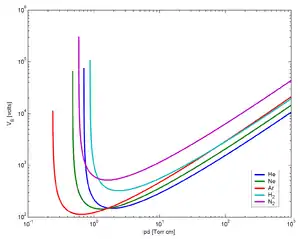 Типові значення пробивної напруги, що відповідає мінімуму кривої Пашена, для різних газів і різних. матеріалів катода знаходяться в межах 100...400 В при p∙d = 0,2...1 Па∙м.