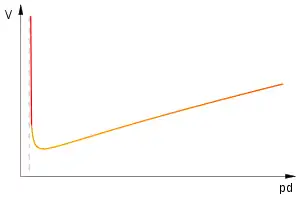 Графіком цієї функції є так звана крива Пашена. Підйом кривої при великих pd пояснюється зменшенням довжини вільного пробігу і зниженням імовірності набору необхідної для іонізації енергії. Підйом кривої ліворуч — зменшенням числа зіткнень на довжині проміжку. Існує мінімальна напруга пробою розрядного проміжку. Взявши від похідну по pd і результат прирівнявши до нуля можна визначити величину мінімальної напруги. Отримаємо: