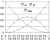 де р2 — частота, з якою зустрічаються носії генотипу АА, 2pq — генотипів Аа та аА, а q2 — з генотипом аа. Ці частоти, при дотриманні вищезазначених умов, будуть сталими із покоління в покоління, незалежно від зміни кількості індивідуумів в популяції і від того, наскільки великі або малі значення p та q.